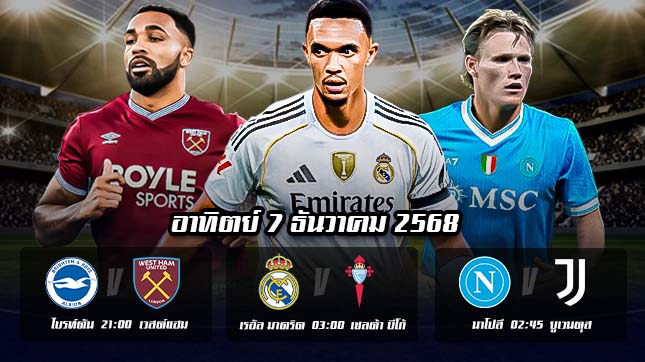 ทีเด็ดบอลประจำคืนวันอาทิตย์ที่ 7 ธันวาคม 2568 นี้ เรามีโปรแกรมฟุตบอลจากสามลีกใหญ่ที่อัดแน่นไปด้วยความมันส์ โดยเฉพาะการวัดกึ๋นของทีมยักษ์ใหญ่ที่กำลังขับเคี่ยวเพื่อตำแหน่งจ่าฝูงและโควต้ายุโรป