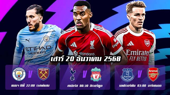 ค่ำคืนวันเสาร์ปลายปีแบบนี้ พรีเมียร์ลีกยังคงเป็นเวทีที่เต็มไปด้วยคุณภาพและความเข้มข้น โดยเฉพาะสัปดาห์นี้ที่มีเกมระดับชี้ชะตาโมเมนตัมของหลายทีม โดยทีเด็ดบอลคืนนี้ เราจะพาเจาะลึก 3 คู่เด่นประจำวัน ได้แก่ แมนฯ ซิตี้ พบ เวสต์แฮม, สเปอร์ส พบ ลิเวอร์พูล และ เอฟเวอร์ตัน พบ อาร์เซนอล ซึ่งต่างก็มีผลต่อตารางคะแนนด้วยกันทั้งสิ้น